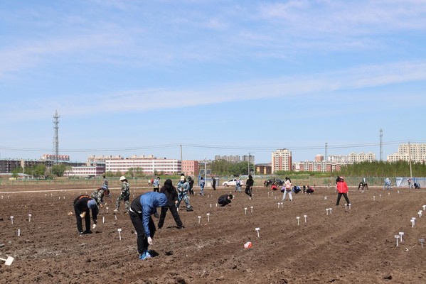 5月15日清晨6:30,师生党员迎着明媚的晨光,在学校北门集合,乘坐大客车奔赴安达基地。基地田地虽因前夜降雨泥泞,但符合播种要求,师生们先培训再分工,迅速投入劳动。土地湿黏,阳光强烈,师生们的鞋上沾满了泥土,脸上身上满是汗水,但大家欢声笑语、干劲十足。