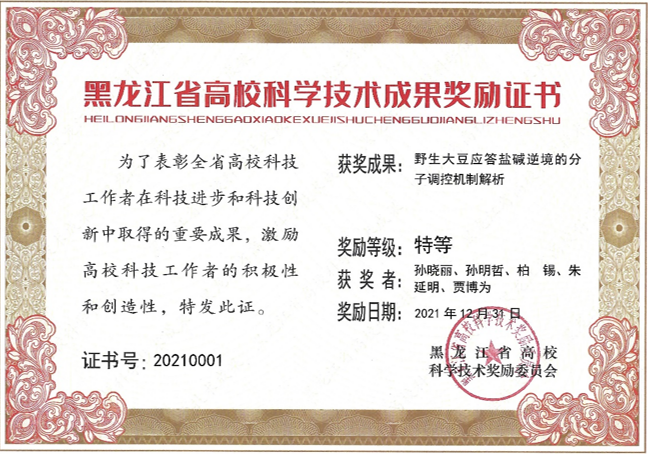 近日,2021年度黑龙江省高校科学技术奖评审结果揭晓,买球赛的app官网孙明哲/孙晓丽教授团队申报的“野生大豆应答盐碱逆境的分子调控机制解析”荣获农学领域唯一特等奖。2021年度黑龙江省高校科学技术奖通过专业评审组初评、评委会评审及省高校科技奖励委员会审定等程序,决定授予98个项目黑龙江省高校科学技术奖,其中特等奖10项,一等奖45项,二等奖43项。