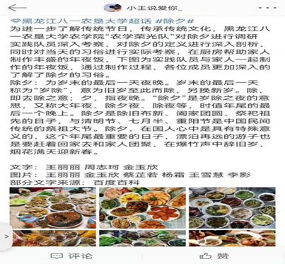 2021年1月25日--2月5日,为引导青年学生进一步了解传统节日,认同传统文化、传承传统文化,农学荣光队严格按照国家以及所在地疫情防控要求,在做好防护的基础上线上线下进行社会实践。农学荣光队于黑龙江省齐齐哈尔市甘南县,开展了线上线下相结合寒假“三下乡”活动。