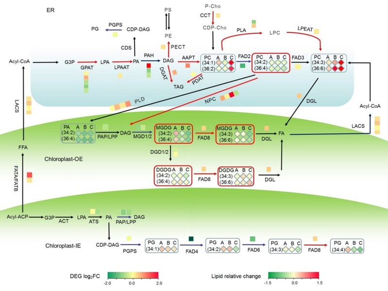 该研究发现,盐胁迫导致高粱叶片中质体(叶绿体)脂质的比例显著下降,尤其是MGDG和PG,这可能极大地损害光合膜的稳定性和叶绿体的功能(图2)。但是,在盐胁迫下,高粱叶片细胞中也发生了明显的适应性膜脂重塑。主要表现在:①细胞质和质体(叶绿体)之间脂代谢途径的调整导致C36:4 PC转化为C36:6 MGDG,进一步转化为C36:6 DGDG,以补充叶绿体脂质并保持光合膜的完整性;②双层脂质与非双层脂质的比率增加,特别是DGDG/MGDG的比例增加,有利于光合膜的稳定性;③主要磷脂和DGDG的双键指数升高意味着膜流动性增加(图2)。