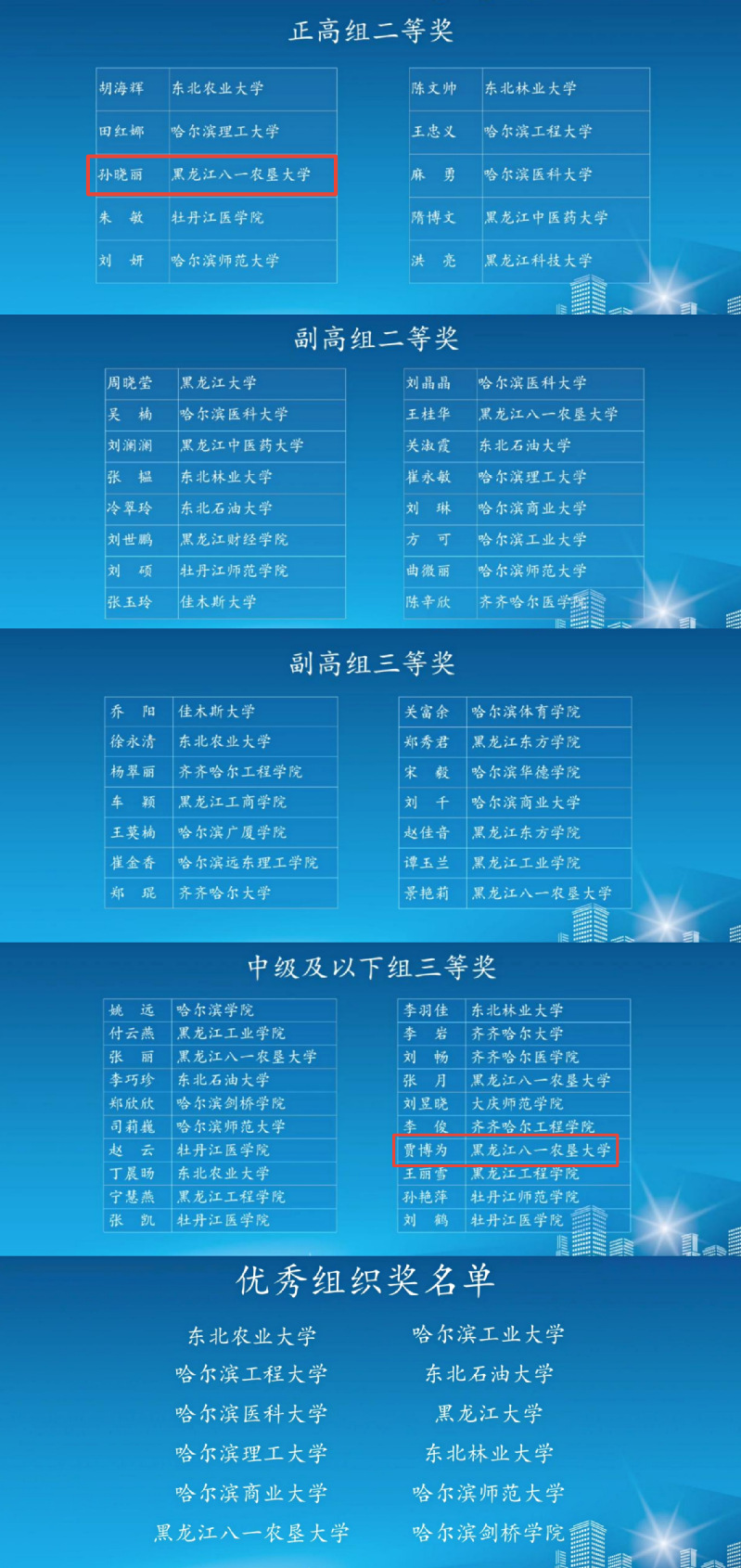 5月7日至8日,黑龙江省第二届高校教师教学创新大赛决赛暨国赛选拔赛以线上方式在东北农业大学举办。来自全省38所本科高校的205个参赛个人(团队)参加,70名教师(团队)入围决赛。买球赛的app官网推荐的6名教师(团队)喜获佳绩。其中,买球赛的app官网孙晓丽团别荣获正高组二等奖,贾博为团队荣获中级及以下组三等奖。买球赛的app官网荣获“优秀组织奖”。