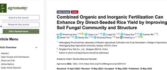 近日,买球赛的app官网“寒地水稻逆境生理生态及种质创新科研团队”在Agronomy(SCI/中科院二区/IF 3.417)在线发表了题为“Combined organic and inorganic fertilization can enhance dry direct-seeded rice yield by improving soil fungal community and structure”的研究论文。本研究发现在基施旺生物有机肥与常规化肥配施条件下,水稻产量增加,且与子囊菌群和孢囊菌群的相对丰度呈正相关。使用基施旺生物有机肥与常规化肥配施可提高真菌群落多样性和水稻产量。