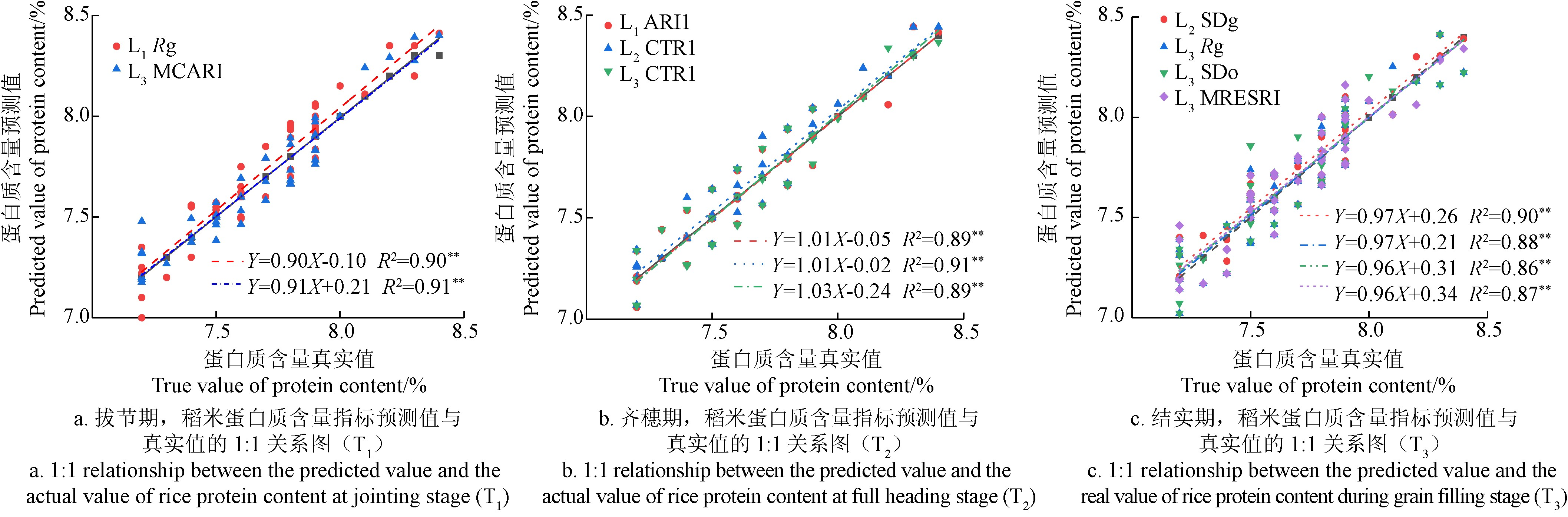 图 3 不同时期稻米蛋白质含量指标预测值与真实值的 1﹕1 关系图 Fig.3 The 1:1 relationship between the predicted value and the actual value of the protein content of rice in different periods |