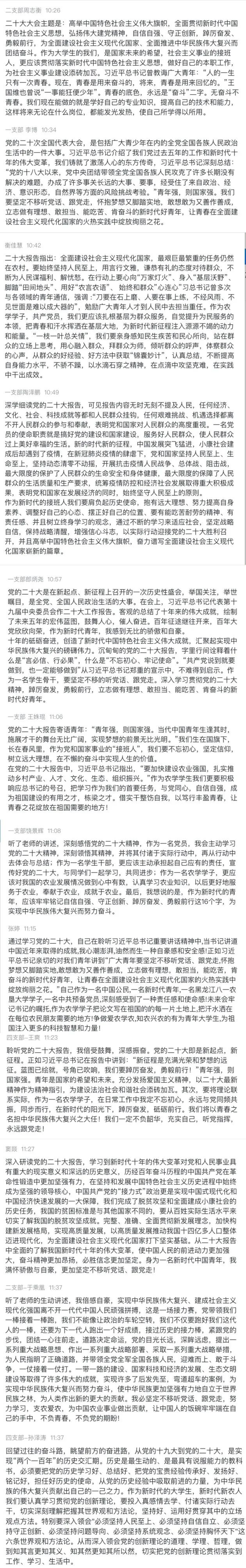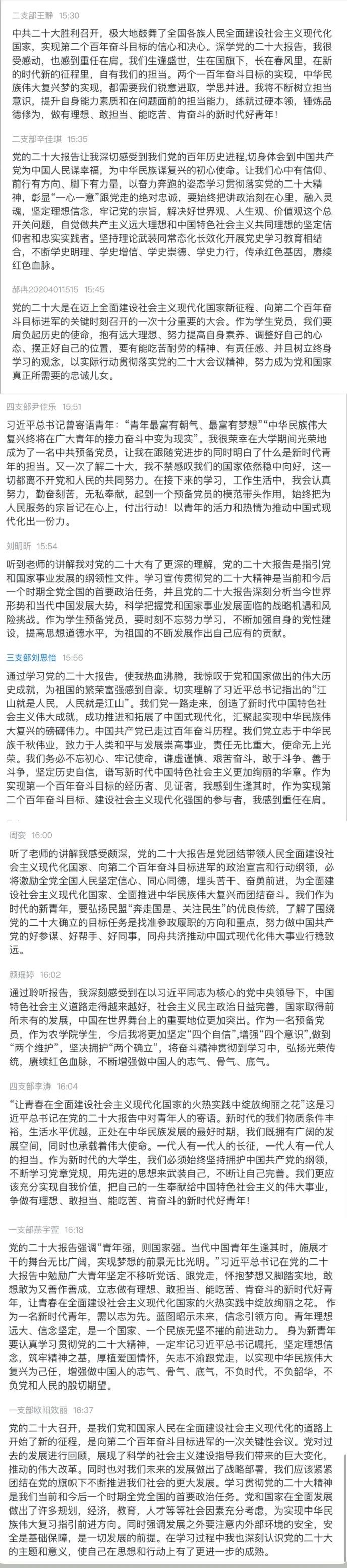 学院党员认真学习,并在评论区积极互动。校院党的二十大精神宣讲团成员、学生一支部党员衡佳慧说:二十大报告指出全面建设社会主义现代化国家,最艰巨最繁重的任务仍然在农村。作为农学学子,共产党员,我们更应该扎根基层为群众服务,自觉提升为民服务的本领,把青春和汗水挥洒在基层大地,为新时代新征程注入源源不竭的动力和能量。学生二支部党员周志衡说,青春的底色,永远是“奋斗”二字。我们要认真学习党的二十大精神,学好专业知识,提高技术和能力,这样将来无论在什么岗位,都能发光发热,使自己所学得以所用。学生三支部党员颜瑶婷说,作为一名预备党员,作为农学院学生,今后我将更加坚定“四个自信”,增强“四个意识”,做到“两个维护”,坚决拥护“两个确立”,将奋斗精神贯彻到学习中,弘扬光荣传统,赓续红色血脉,不断增强做中国人的志气、骨气、底气。学生四支部党员李涛说,一代人有一代人的长征,一代人有一代人的担当。作为新时代的大学生党员,我们必须始终坚持拥护中国共产党的纲领,不断学习党章党规,用先进的思想来武装自己,争做有理想、敢担当、能吃苦、肯奋斗的新时代好青年。