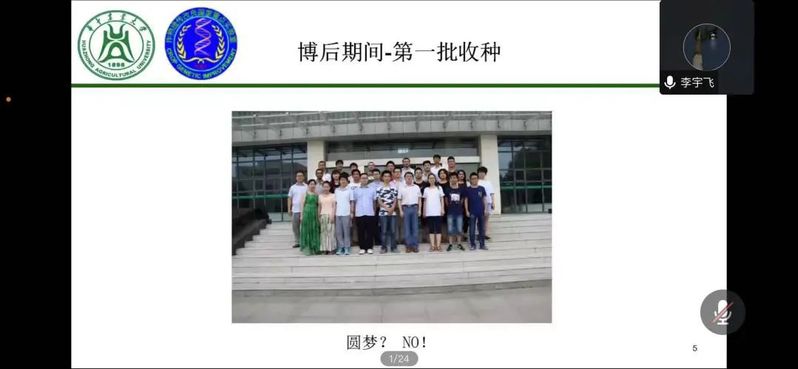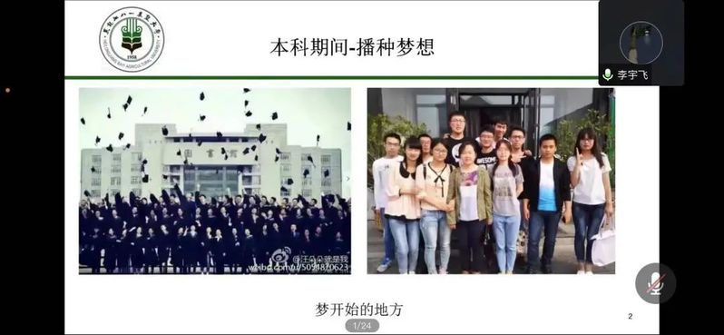 会议开始,王洋对两位优秀校友进行了欢迎,希望两位校友可以带着经验以及经历多交流、不仅仅是对师弟师妹们的榜样建设,也期待下一步可以与研究生的学术生活碰撞出火花;希望种工专业以及农学专业的学生能像种子一样,以优秀校友为榜样,破土而出,茁壮成长;希望无论是校友还是在校生,农学院是大家的港湾,是相亲相爱的一家人,等待春暖花开,一起线下相聚。随后,李宇飞博士分享了自己上学时候的点滴:坦言自己也曾迷茫,在班主任苗老师的帮助下,一步一步走向正轨;也曾为了求学不辞辛苦,从大庆买的30余个小时的无座票,只为了能够与导师面对面谈一下实验方案;也曾投一个期刊也不眠不休,最后可能结果也并不如意;但是这些都会过去,坚持住总会看到柳暗花明;在李宇飞的眼中,无论农学还是种子专业,是一个朝阳性的行业,已经得到了很多领导的重视,将会有好的发展历程以及不菲的收入,希望大家能够干一行,爱一行,像种子一样茁壮成长;秦洪涛分享了自己的本科生涯,考研时苗老师的推荐为他指点了方向,虽然在硕士时候也犹豫过自己的选择方向,但工作后还是考虑到回归科研,他通过自己的近期工作诠释了只有努力才有结果,期望师弟师妹能够以梦为马,不负韶华。