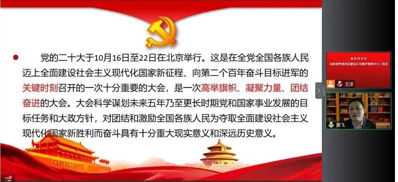 学习培训活动邀请到马克思主义学院教师张方成、高飞,分上下午两场分别以《新时代十年的伟大变革及其决定性因素——学习贯彻党的二十大精神》和《全面建设社会主义现代化国家的政治宣言和行动纲领——深入学习领会党的二十大精神》为题进行专题讲座。