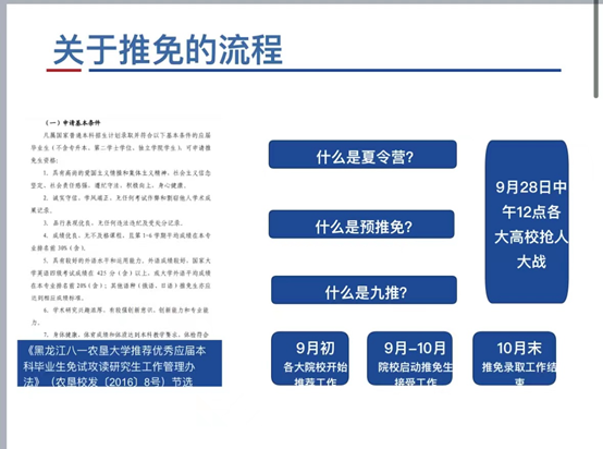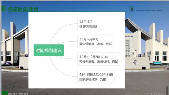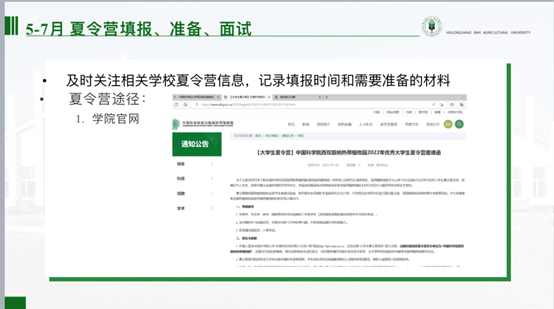 玉外从保研申请条件,遴选办法,保研时间规划,夏令营途径和投递战略,四个方面向同学们分享了自己的经验。关于研究生推免,能力考核内容包括:科研成果奖;科技发明与专利;学术著作、学术论文;主持并完成省级以上大学生创新创业项目;获得省级以上各类专业竞赛、创新创业竞赛奖励等。她指出,3-5月为信息收集阶段,查询目标学校,记录该学校近两年夏令营、预推免时间和要求,可以做初步的准备。5-7月应当及时关注相关学校夏令营信息,记录填报时间和需要准备的材料。9月初-9月28日进行预推免填报、准备、面试。玉外提醒同学们要注重成绩,特别是第一课堂成绩占90%,科研占10%,鼓励大家认真学习。社会实践,让大家注重团队协作和机会,多参加多体验。在结束时,寄语即将面临考研的同学们,“路虽远,行则将至。事虽难,做则必成”。