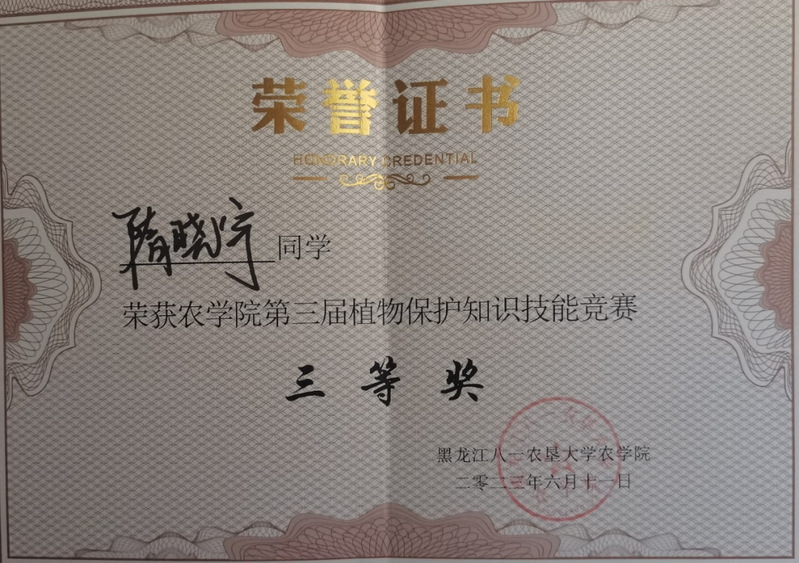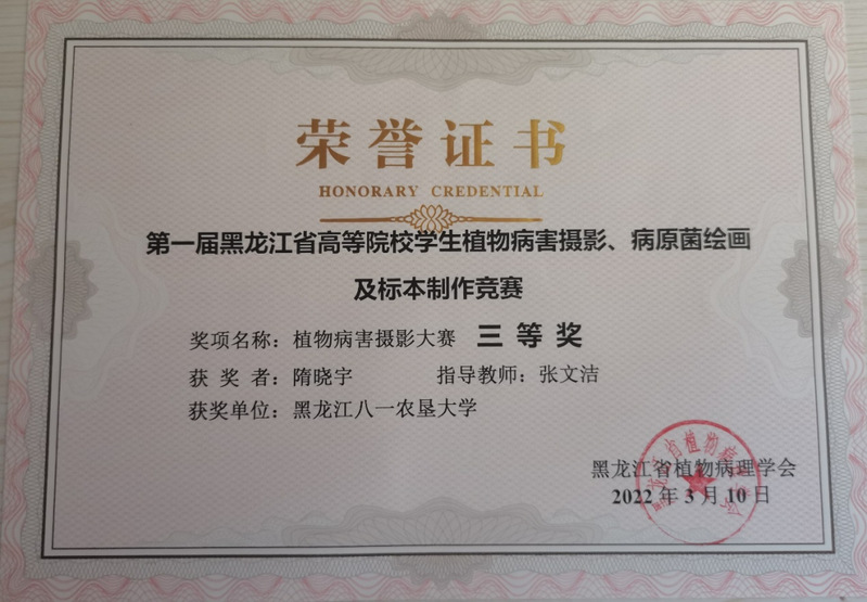 第一届黑龙江省高等院校学生植物病害摄影、病原菌绘画及标本制作竞赛中植物病害摄影大赛三等奖