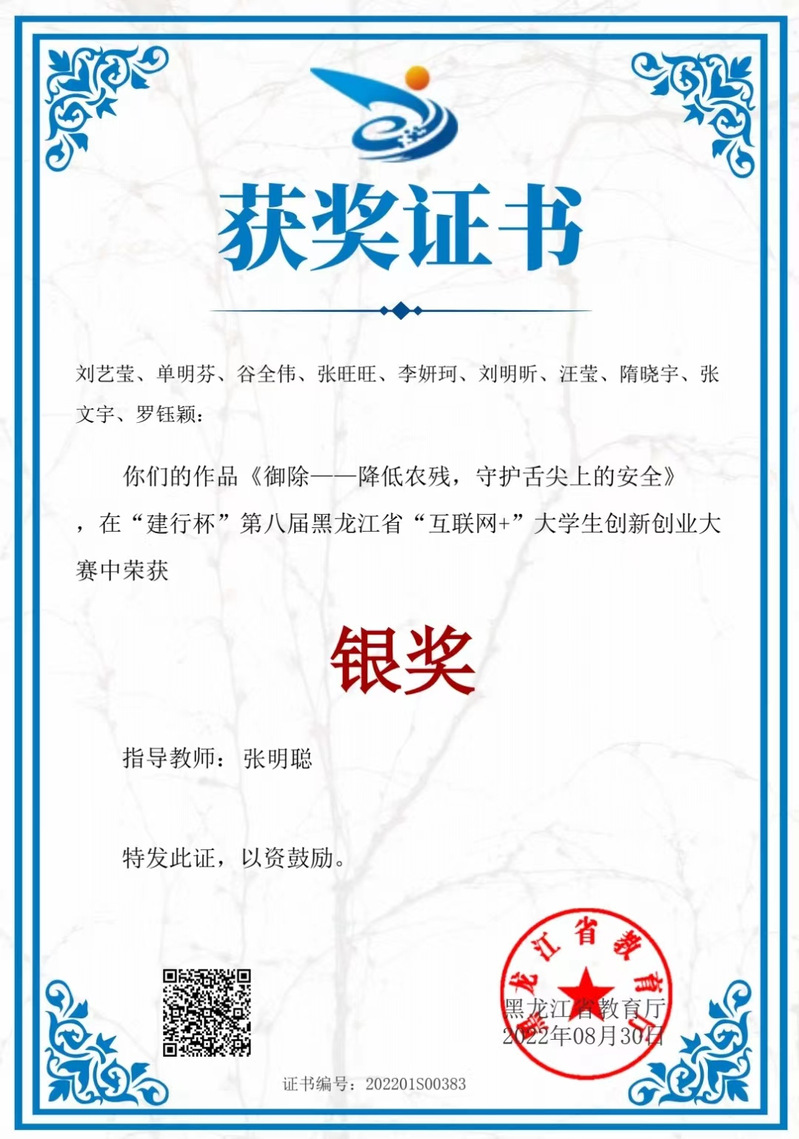 “建行杯”第八届黑龙江省“互联网+”大学生创新创业大赛银奖