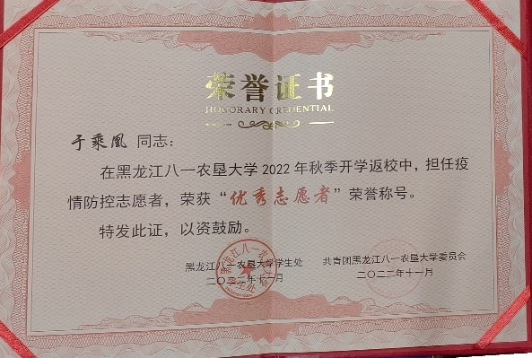 校十佳大学生、省三好学生、 三好学生、优秀共青团员、优秀志愿者、优秀学生骨干、优秀运动员、卓越运动员、文体活动突出贡献奖;国家奖学金、国家励志奖学金;一等综合奖学金、二等综合奖学金、三等综合奖学金;“建行杯”第八届黑龙江省“互联网+”大学生创新创业大赛铜奖;第21届全国大学生田径锦标赛男甲110米栏第五名;中国高等农业院校第十届大学生运动会男乙400栏、110米栏双季军;黑龙江省第18届大学生运动会男甲400米栏、110米栏双冠军;两次打破校运会男400米栏记录。
