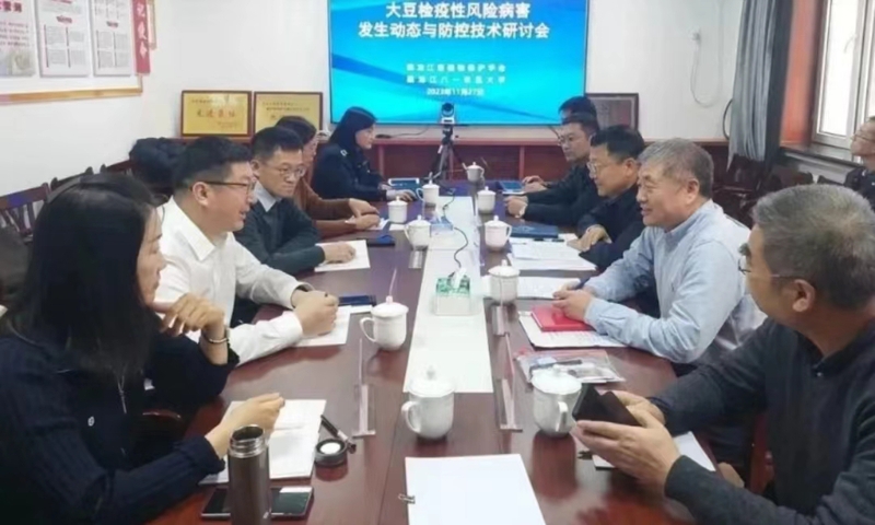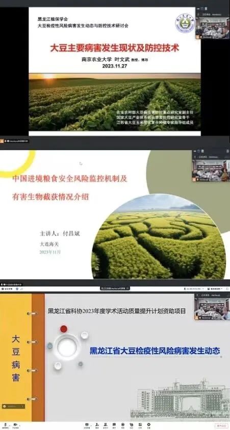 11月27日,由黑龙江省植物保护学会和黑龙江八一农垦大学联合举办的“大豆检疫性风险病害发生动态与防控技术研讨会”,采取线上线下相结合的方式,在省植检植保站召开。省植保学会会理事长、省植检植保站站长宋显东主持会议,来自全国农技中心、南京农业大学、中国农业大学、黑龙江八一农垦大学、东北农业大学、大连海关、北大荒集团和黑龙江省植检植保站的专家,共20人参加了研讨会。