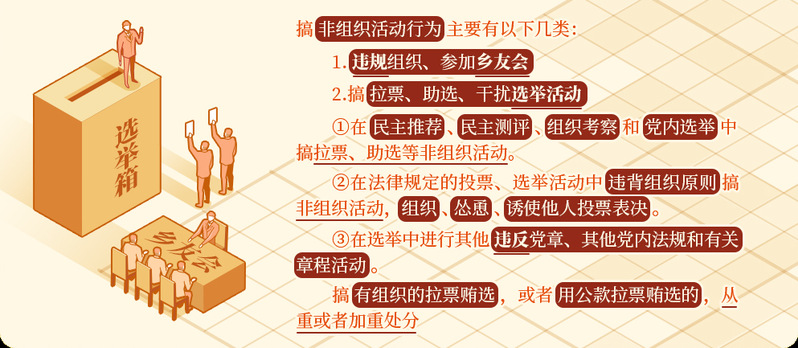 《中国共产党纪律处分条例》第八十二条、第八十三条对搞非组织活动行为列出负面清单,对违规组织、参加乡友会,以及搞拉票、助选、干扰选举活动作出处分规定。
