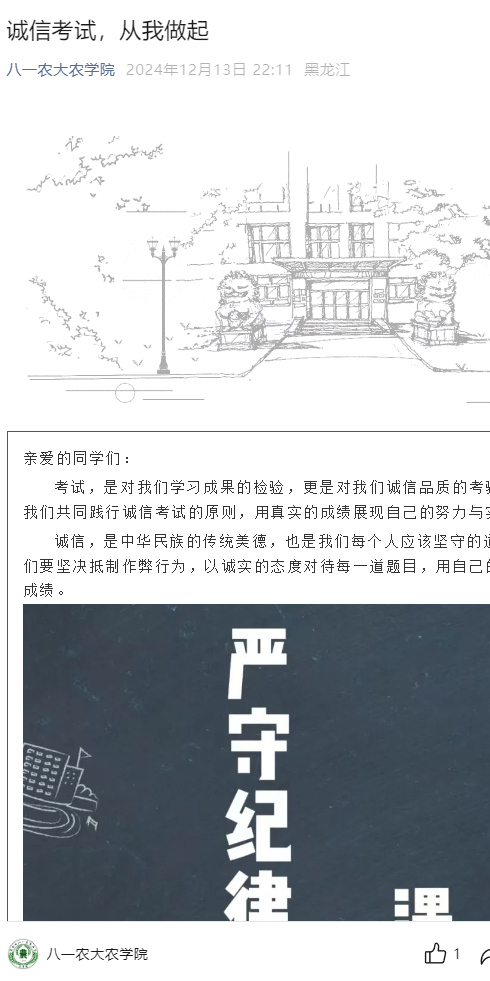 各班级班主任以不同形式开展诚信考试教育主题班会,引导同学们树立正确的考试观念,鼓励同学们将考试视为自我提升的契机,以自信、从容的心态迎接挑战,在备考过程中查漏补缺,不断进步,并对《黑龙江八一农垦大学本科生考试管理及违纪处理办法》进行了详细的解读,多角度强调诚信考试的重要性,让学生明晰考试违纪作弊的严重后果。告诫同学们务必心存敬畏,坚决摒弃作弊念头,以严谨态度对待考试,争取做到期末考试“零作弊、零违纪”,以最好的心态考出自己最满意的成绩,做一名诚实守信的大学生。