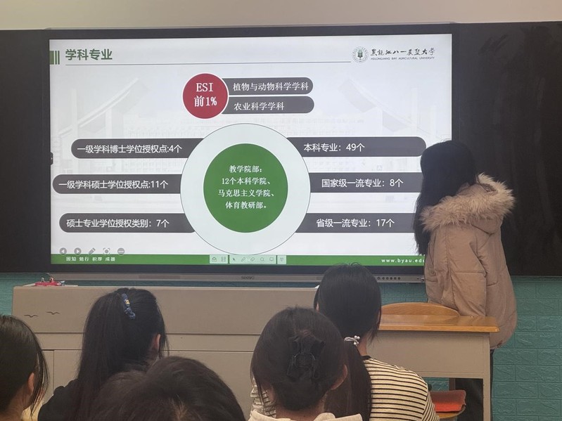 白淑芸同学则介绍黑龙江八一农垦大学的师资力量,学科建设,专业设置,科研平台以及学校的硕士点、博士点等。
