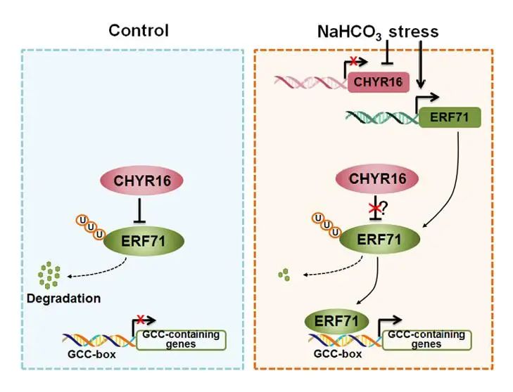 该研究首先通过IP-MS技术筛选GmERF71互作蛋白GmCHYR16,并利用Co-IP、LCI、BiFC和共定位分析,验证了GmERF71-GmCHYR16在细胞核中的相互作用。通过体内泛素化、无细胞降解和CHX chase试验,证明GmERF71存在26S蛋白酶体依赖的蛋白降解,GmCHYR16泛素化修饰GmERF71促进其蛋白降解,碳酸盐胁迫可抑制GmCHYR16介导的GmERF71泛素化及蛋白降解。对GmCHYR16-OX耐盐碱功能分析,发现GmCHYR16负调控过表达拟南芥和大豆对NaHCO3胁迫的耐受性。随后利用拟南芥atchyr1和atchyr7突变体及atchyr1atchyr7双突变体进一步验证了CHYR E3连接酶对GmERF71蛋白降解和碳酸盐胁迫耐性的调控作用。遗传分析显示GmERF71过表达提高大豆的碳酸盐胁迫耐性,GmCHYR16通过抑制GmERF71降低大豆的NaHCO3胁迫耐受性。最终,本研究揭示了GmCHYR16泛素化修饰GmERF71,促使GmERF71蛋白通过26S蛋白酶体降解,从而负调控碳酸盐胁迫的耐受性。