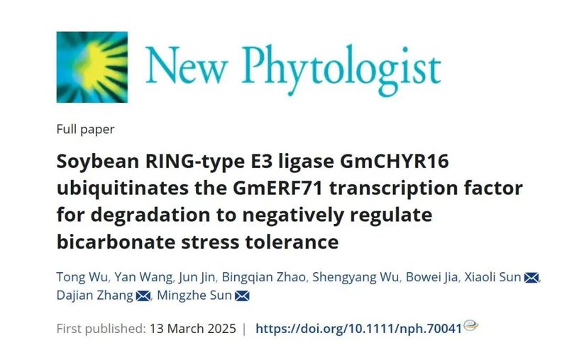 近日,买球赛的app官网农学院孙晓丽/孙明哲团队在国际知名期刊New Phytologist(中科院一区TOP,IF=8.3)发了题为“Soybean RING-type E3 ligase GmCHYR16 ubiquitinates the GmERF71 transcription factor for degradation to negatively regulate bicarbonate stress tolerance”的研究论文。该研究以耐苏打盐碱功能显著的转录因子GmERF71为切入点,揭示了GmCHYR16通过泛素化修饰GmERF71负调控大豆碳酸盐胁迫应答新机制,该研究有助于深入理解大豆碳酸盐胁迫耐性的分子机制,为通过生物育种手段改良大豆耐盐碱性提供了新的理论依据和潜在靶点。
