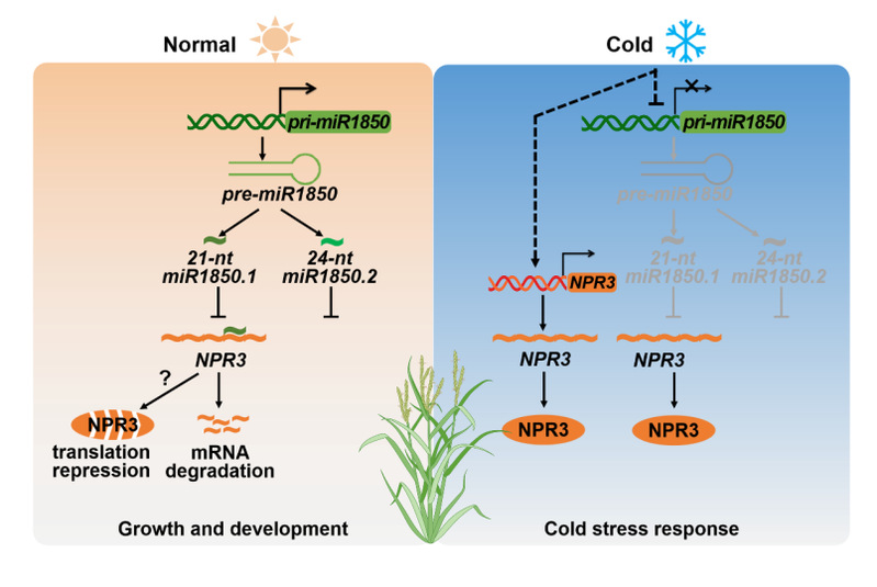 该研究通过冷胁迫条件下的表达模式分析、耐冷功能的验证、靶向调控关系的解析以及产量性状的评估,揭示miR1850.1靶向抑制NPR3平衡水稻产量与耐冷性的调控新机制。Pri-miR1850加工产生两种成熟体:21-nt miR1850.1和24-nt miR1850.2。miR1850.1通过mRNA剪切作用抑制NPR3的表达。在正常生长条件下,NPR3的表达受到miR1850.1的抑制,维持在较低水平,从而保证水稻的正常生长和发育。当水稻受到低温胁迫时,pri-miR1850的表达被抑制,导致miR1850.1的积累水平显著下降,从而解除了对NPR3表达的抑制,激活了下游的冷应答信号通路。