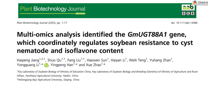 近日,农学院作物学科新引进教师姜海鹏以第一作者(黑龙江八一农垦大学为第二署名单位)在国际期刊《Plant Biotechnology Journal》(IF=11.2)发表多组学分析鉴定GmUGT88A1基因协同调控大豆异黄酮含量与抗胞囊线虫(Multi-omics analysis identified the GmUGT88A1 gene, which coordinately regulates soybean resistance to cyst nematode and isoflavone content)的研究论文,在大豆抗胞囊线虫基因鉴定方面取得重要进展。