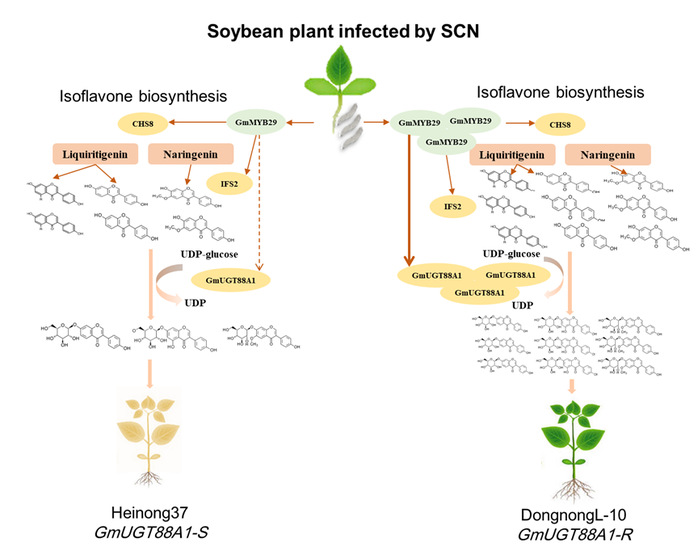 该研究从抗SCN的高异黄酮大豆种质东农L-10中发现主效抗病位点,并通过精细定位和基因功能研究发现编码异黄酮-7-O-葡萄糖糖基转移酶的GmUGT88A1基因为该位点的关键基因,系统解析了GmUGT88A1基因所在分子网络GmMYB29-GmCHS8/GmIFS2-GmUGT88A1的作用机制,揭示了编码葡萄糖糖基转移酶的GmUGT88A1基因协同调控大豆对SCN抗性、异黄酮含量和粒重的分子网络,该结果在大豆异黄酮、抗病性和产量的协同改良方面具有广阔应用前景。