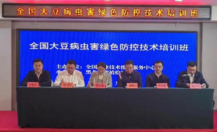 为了贯彻落实《“虫口夺粮”保丰收行动方案》,按照《农技员进村包户联主体单产提升农技行实施方案》要求,全力做好大豆病虫害绿色防控,助力大豆大面积单产提升。2025年6月5日,全国农业技术推广服务中心在黑河市爱辉区举办“大豆病虫害绿色防控技术培训班”,全国农业技术推广服务中心鄂文弟副主任、省农业农村厅马晓非总农艺师,农业农村部种植业管理司植保植检处、全国农业技术推广服务中心病虫害防治处,及黑龙江、内蒙古、吉林、辽宁、江苏、安徽、山东、河南、湖北、湖南、重庆、四川、贵州、云南等省份和我省部分大豆生产大县植保部门专业技术人员,共60余人参加培训。
