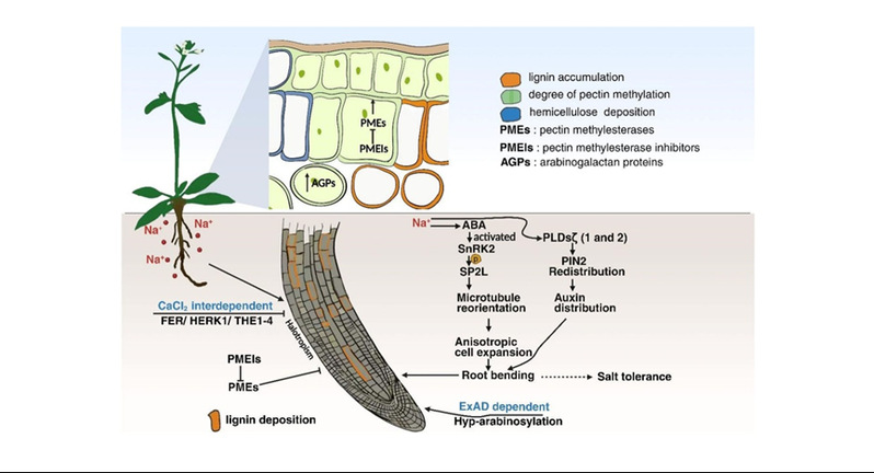 在盐胁迫下,植物细胞壁发生显著的结构与成分改变,以适应高盐环境。叶片中果胶积累与去甲基酯化增强,木质素沉积增多,阿拉伯半乳聚糖蛋白(如阿拉伯糖)含量上升,共同提升细胞壁机械强度与稳定性。同时,根部为逃避盐胁迫而发生向盐性(halotropism)响应,木质素沉积增加,扩展蛋白阿拉伯糖基化修饰增强,同时果胶甲基酯酶(PME)活性受抑,从而调控细胞壁延展性与离子通透性。这些动态变化有效增强细胞壁的物理屏障功能,维持细胞壁完整性(CWI)。