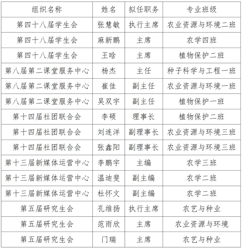 买球赛的app官网2025年学生组织管理层换届竞聘工作已完成个人申报、资格审查、竞职演讲、评审投票、组织考察等环节,经学院团委研究决定,拟任命杨杰等15名同学为农学院学生组织管理层学生骨干,现将具体名单公示如下: