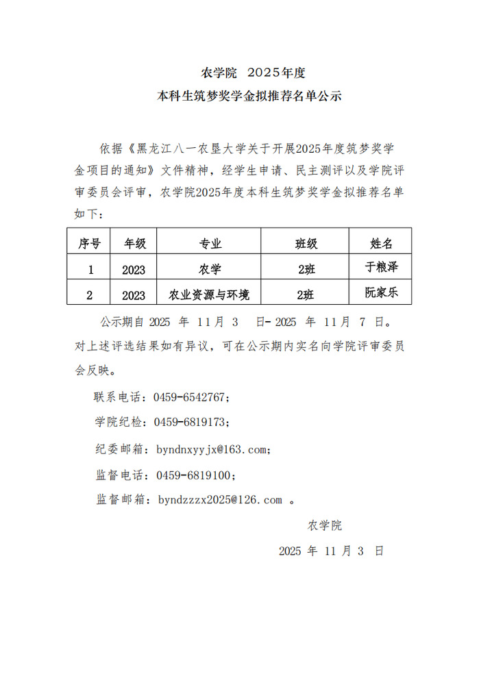 农学院2025年度本科生筑梦奖学金拟推荐名单公示