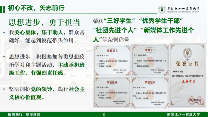 11月25日,黑龙江八一农垦大学2024-2025年度“十佳大学生”评选会圆满落幕,经个人申请、学院推荐、资格审查、现场答辩等环节,买球赛的app官网2023级农学专业杜怀文荣获“十佳大学生”荣誉称号。