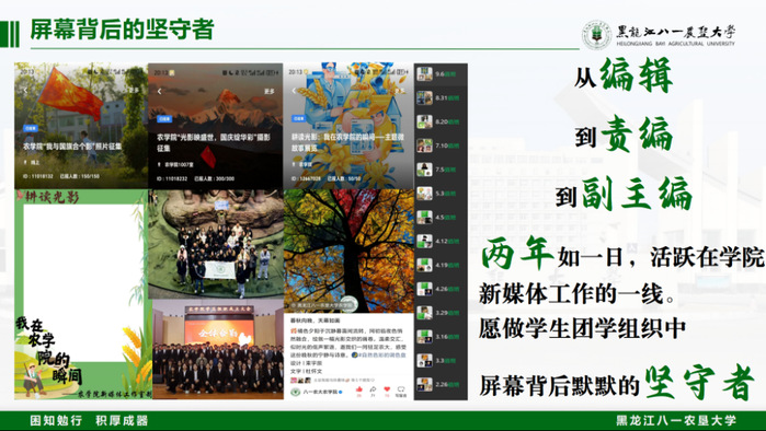 屏幕背后的坚守者:作为农学院新媒体工作室副主编,愿做学生团学组织中默默的坚守者,从编辑到责编再到副主编,两年来参与公众号制作150余次,独立策划原创推文12条,用镜头与文字讲述农学故事。