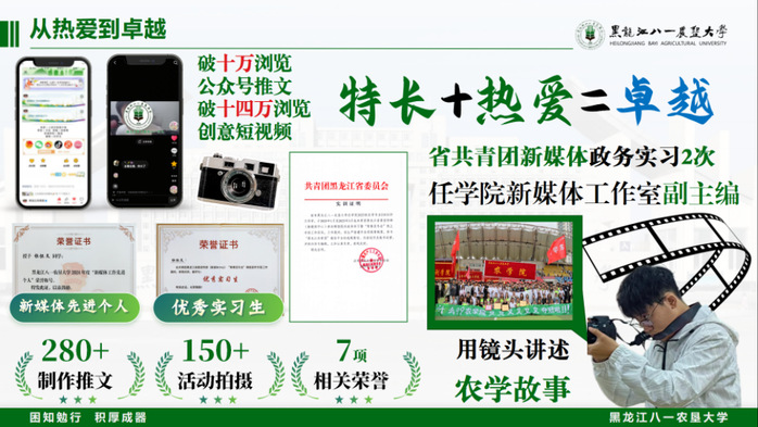 以自身的新媒体技能特长,两次在共青团黑龙江省委实习进行新媒体线上实习,参与省团委公众号运维,制作推文60余条,部分原创内容推文累计浏览量破十万,获评“优秀实习生”。