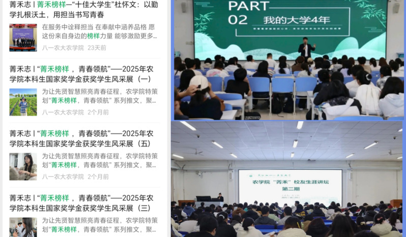 学院以打造特色育人品牌为目标,分层分类开展系列学业赋能活动,深化学风建设成效。先后举办“朋辈领航,学业帮扶”活动5期、“农路求知,经验共享”保研分享会、“学业深耕,成长进阶”经验分享会、“菁禾榜样,博研有约”研途分享会及“赶路,也寻路-大学四年的内在探索”专题分享会等精品活动,7期,“菁禾榜样”分享活动8期,充分发挥朋辈引领与榜样示范作用,累计覆盖1700余人次;全校首创开展大三学生毕业预警104人次,有效提醒、规避学生因个别科目疏忽造成的学业困境,切实以学风建设赋能学生成长成才,营造勤学善思、笃行奋进的优良育人氛围。