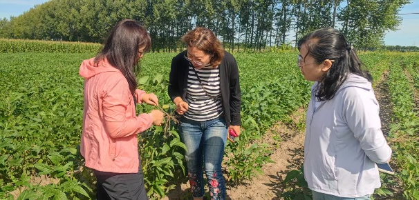 8月16日与学院张亚玲教授、徐晓丹老师和园艺园林学院吴瑕副教授一行到肇州县肇州镇实地调研玉米和大豆田间病虫害发生及品种产量趋势。