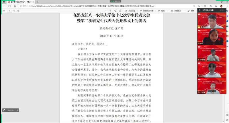 校学代会已经胜利闭幕,为及时传达学代会精神,农学院组织开展了学习董广芝书记在学代会上的重要讲话精神,传达了董广芝书记对广大青年学生的殷切期望。以深入学习贯彻党的二十大为工作指引,采用集体学习与个人自学、线上线下相结合的方式,结合当前疫情防控形式,创新开展学习活动,掀起了学习的热潮。