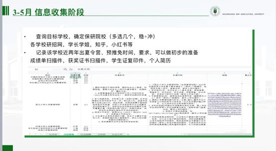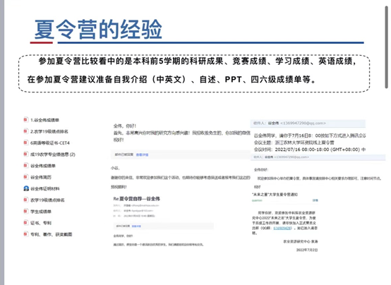 玉外从保研申请条件,遴选办法,保研时间规划,夏令营途径和投递战略,四个方面向同学们分享了自己的经验。关于研究生推免,能力考核内容包括:科研成果奖;科技发明与专利;学术著作、学术论文;主持并完成省级以上大学生创新创业项目;获得省级以上各类专业竞赛、创新创业竞赛奖励等。她指出,3-5月为信息收集阶段,查询目标学校,记录该学校近两年夏令营、预推免时间和要求,可以做初步的准备。5-7月应当及时关注相关学校夏令营信息,记录填报时间和需要准备的材料。9月初-9月28日进行预推免填报、准备、面试。玉外提醒同学们要注重成绩,特别是第一课堂成绩占90%,科研占10%,鼓励大家认真学习。社会实践,让大家注重团队协作和机会,多参加多体验。在结束时,寄语即将面临考研的同学们,“路虽远,行则将至。事虽难,做则必成”。