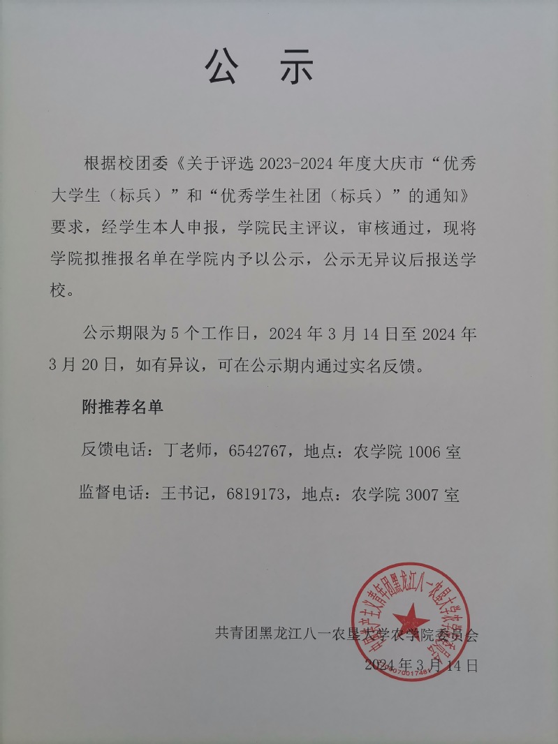 公示 | 农学院《关于评选2023-2024年度大庆市“优秀大学生(标兵)”和优秀学生社团(标兵)“的通知