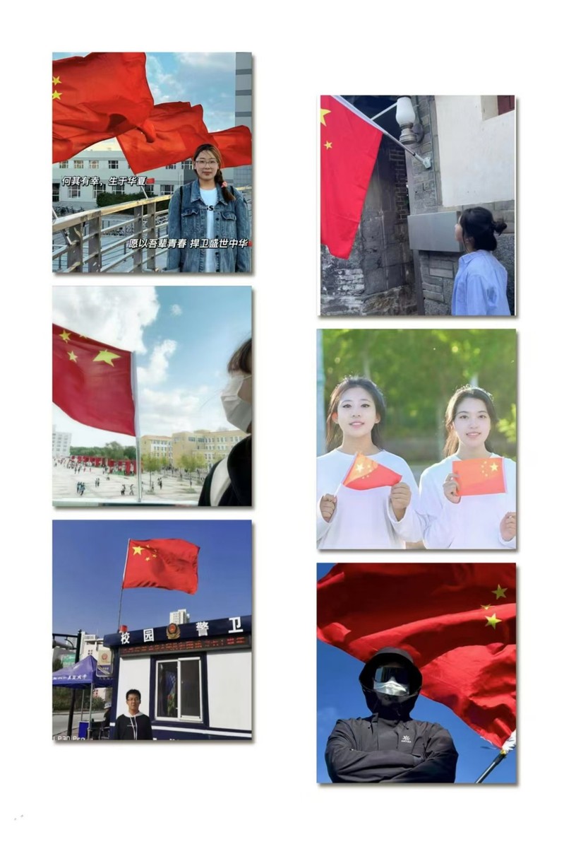 同学们以国旗为背景出境,与国旗同框创意拍摄。