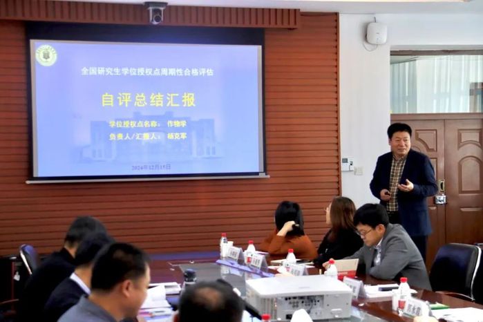 作物学科带头人杨克军代表学位授权点进行汇报,围绕目标与标准、基本条件、人才培养、服务贡献等四个方面,全面汇报了作物学位授权点建设情况和取得的成效。专家组成员在听取汇报后与工作组成员进行了深入的交流。专家组对学位授权点取得的成绩给予肯定,认为作物学位授权点定位准确、办学特色鲜明、培养成效显著;同时,专家组在学科布局优化、研究方向融合、人才培养引领、社会服务强化等方面也提出了建设性意见和建议。