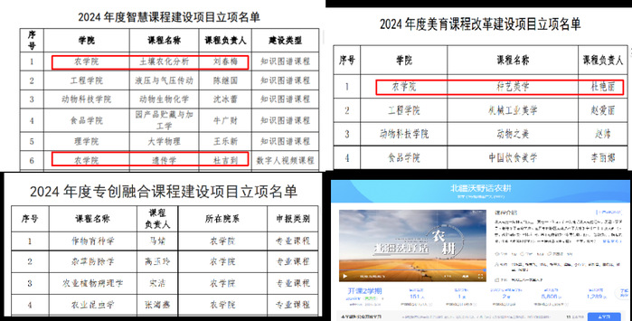加强课程建设。获批省级课程思政示范课1项、全国高等农林院校课程思政教学案例1项、校级数智课程建设项目3项(知识图谱1项、数字人2项)、校级专创融合课程4门,院内重点培育数智课程2门;成立“美育教育工作室”,获批建设校级“种艺美学”课程1门;耕读教育通识课《北疆沃野话农耕》在智慧树正式上线,共22个专业的112名学生选修,同时入选首批全国高等农林院校“十四五”规划建设教材。植物生产类专业课程建设获省级教学成果一等奖。