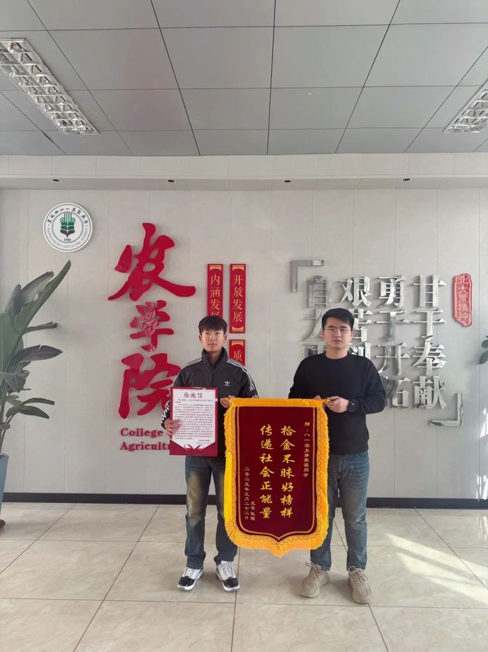 孙家福同学在祥阁花园附近吃完饭,在停车位附近发现一个皮包,经过等待没人领取,包内也没有明显联系方式,遂送至高新分局学苑派出所,后经警方多方联系将皮包送至失主手中。皮包失而复得,失主王先生感激万分。他表示,孙家福同学拾金不昧的行为,使他感受到了农大学子的高风亮节,优秀的学校培养了优秀的人才,感谢八一农垦大学培养了优秀的人才。为表达感激之情,他特意定制了锦旗和感谢信送往学校。