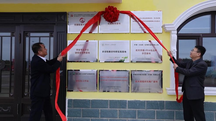 农学院党委书记姜楠与洪河农场有限公司党委书记、董事长贾存来为党建联建共建基地、研究生培养基地、本科实践教育基地揭牌。
