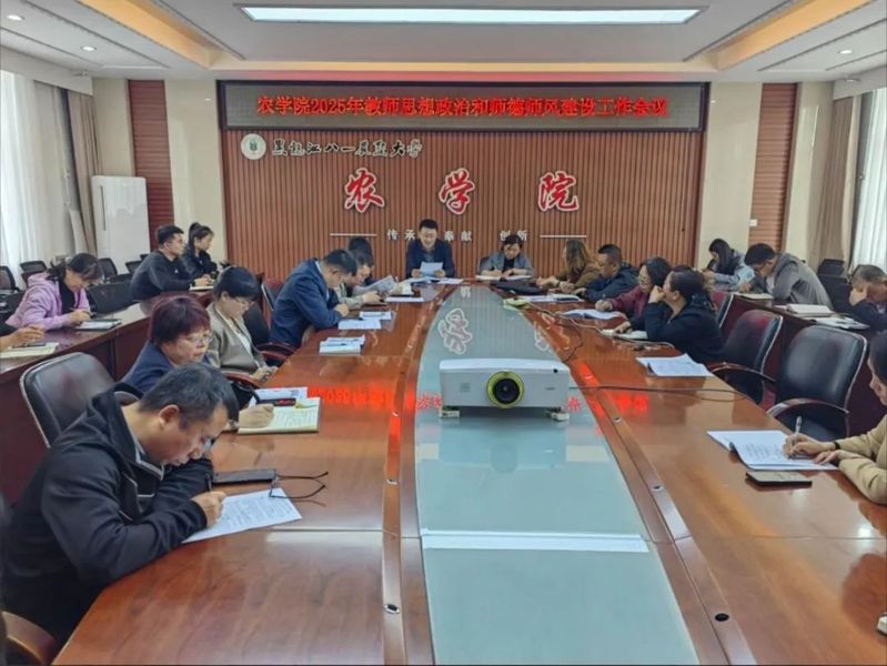 为深入贯彻落实学校2025年党委教师工作委员会(扩大)会议精神,推动部署学院教师思想政治和师德师风建设重点工作,5月21日下午,农学院召开2025年教师思想政治和师德师风建设工作会议。学院领导班子,系主任、党支部书记、骨干教师代表参加会议。