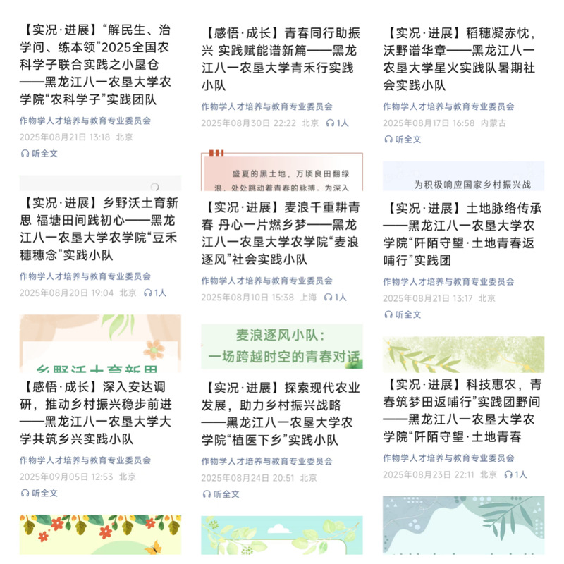 学院深化社会实践成效,以“受教育、长才干、作贡献”为导向,健全全流程管理机制,全年组织培训30余场、组建实践团队450余支,1700余人次师生足迹遍布全国20余省市,实现覆盖范围与参与规模双突破;志愿服务成果丰硕,学院“北大荒青年”助农志愿服务队斩获共青团黑龙江省委主办的北大荒青年助农志愿服务队培训交流暨建功竞赛“特等奖”,获多家媒体报道;“小垦仓-科技赋农兴垦地,志愿助力振乡村”团队获学校首届青年志愿服务大赛银奖;8名团员青年经考核成功对接投身基层锻炼,第四十七届学生会主席赵佳慧成功入选第7届研究生支教团;先后组织20余场,830人次参与省第十九届学生运动会、大庆博物馆、校史馆的志愿服务,彰显农学院青年学子责任担当与青春风采。