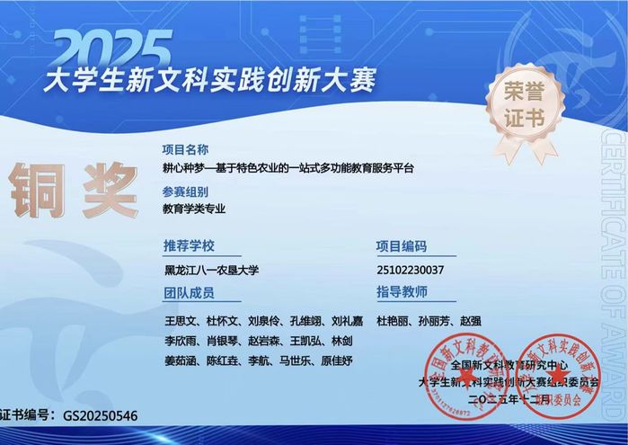 工作室秉持“以赛促学、以美育人”理念,积极组织师生参与新文科创赛。凭借种艺美育领域的特色成果与创新思路,参赛项目一路突围,成功斩获国家级铜奖、省级金奖,充分展现了工作室的美育育人成效。