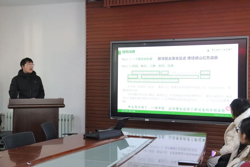 安全培训结束后,杜怀文同学开展新闻稿撰写专题培训。他结合过往优秀实践新闻案例,从新闻稿的结构框架、内容要点、语言风格等方面进行详细讲解,重点分享了实践素材收集、典型人物刻画、成果亮点提炼的技巧,帮助队员们掌握规范、生动的新闻稿撰写方法,以便更好地记录实践过程、传播实践成果。