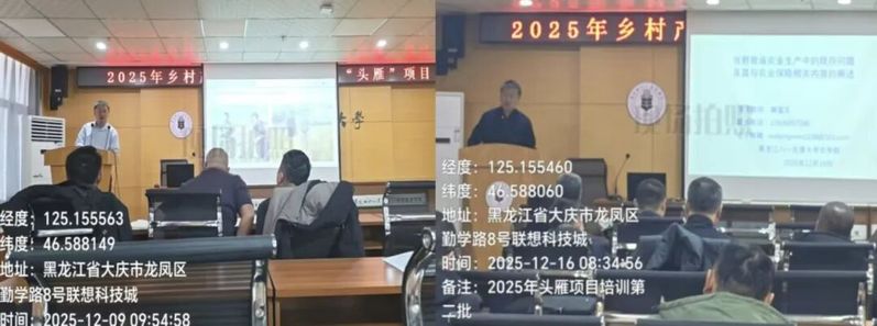 12月,团队成员薛盈文作为2025年乡村产业振兴“头雁”项目指导教师,针对黑龙江省农业生产中的现存问题及农业保险相关政策进行授课,先后培训100人次以上。
