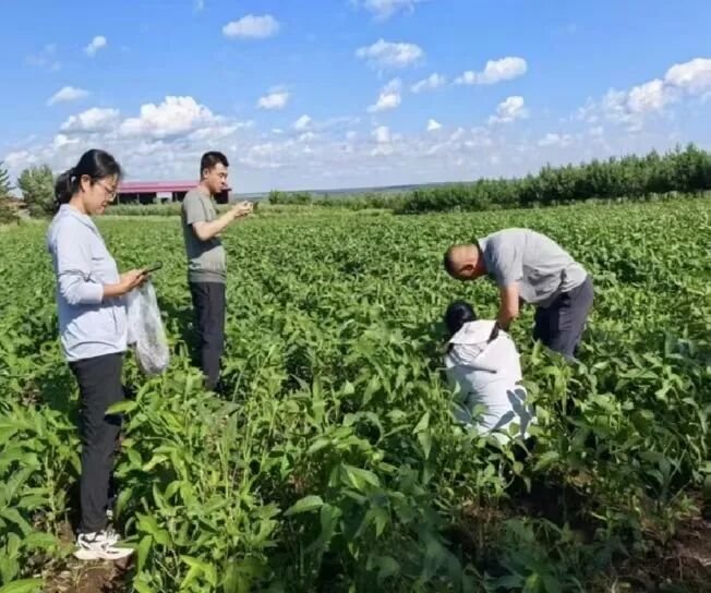 调研组一行先后到第一、第六管理区田间地头,仔细查看不同品种大豆长势,辨识病虫害具体症状,并系统采集了病害标样和土壤样本。在采集过程中,农场领导详细介绍了近年来大豆主要病虫害发生种类、规律及防治难点。调研组结合现场调查与前期试验研究,从品种抗性、重茬影响、区域气候及土壤微生物等多角度,科学剖析了病虫害频发、加重的深层次诱因,并针对如何推广绿色防控技术、优化田间管理方案等提出建议。