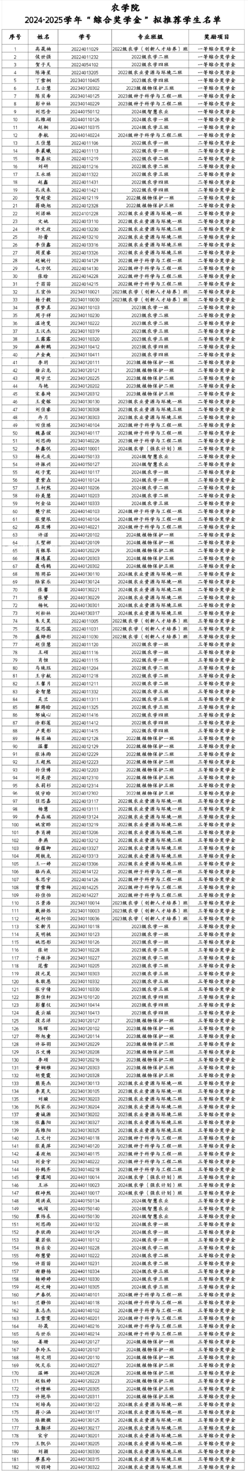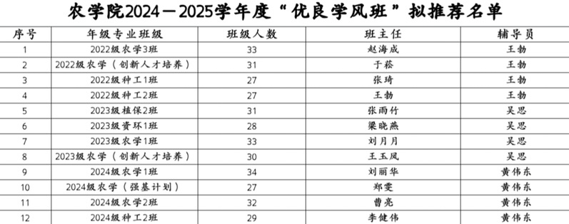 根据《黑龙江八一农垦大学本科生奖励办法》、《黑龙江八一农垦大学奖助学金评选及管理办法》、《黑龙江八一农垦大学本科生奖助学金评选及管理办法》、《黑龙江八一农垦大学研究生奖励暂行办法》的相关规定,拟推荐高晟楠等182名同学获得2024-2025学年“综合奖学金”,董濡闻等140名同学获得2024-2025学年度“三好学生”,2022级农学创新班等12个班级获得2024-2025学年度“优良学风班”等荣誉称号。现将名单向全院师生公示,后附名单。