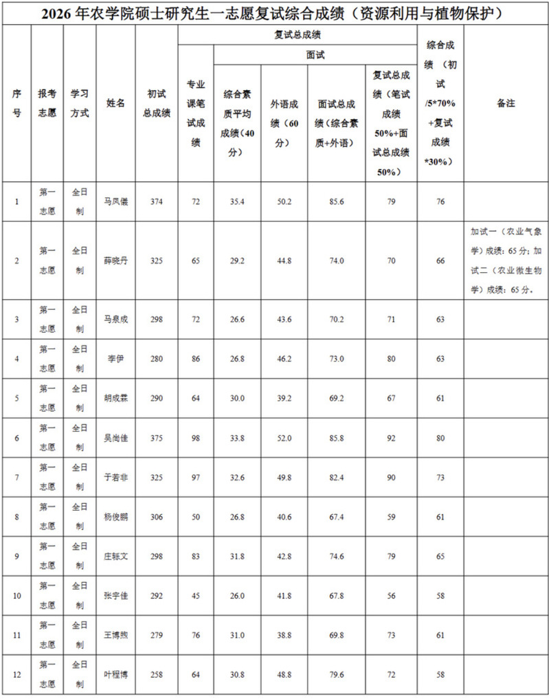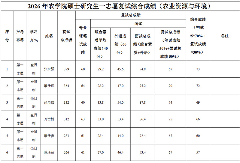 根据《黑龙江八一农垦大学2026年硕士研究生招生考试复试及录取办法》要求,现将农业资源与环境、植物保护、资源利用与植物保护专业考生复试综合成绩进行公示。