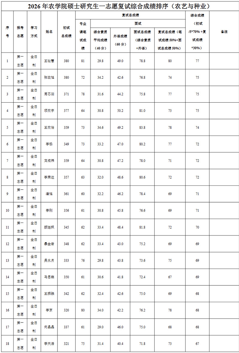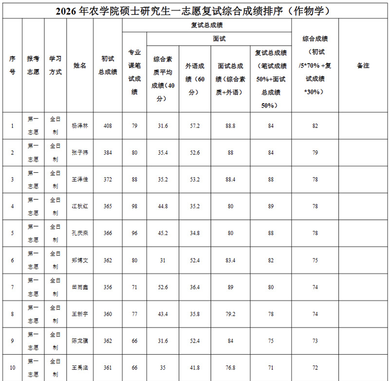 根据《黑龙江八一农垦大学2026年硕士研究生招生考试复试及录取办法》要求,现将作物学、农艺与种业专业考生复试综合成绩进行公示。